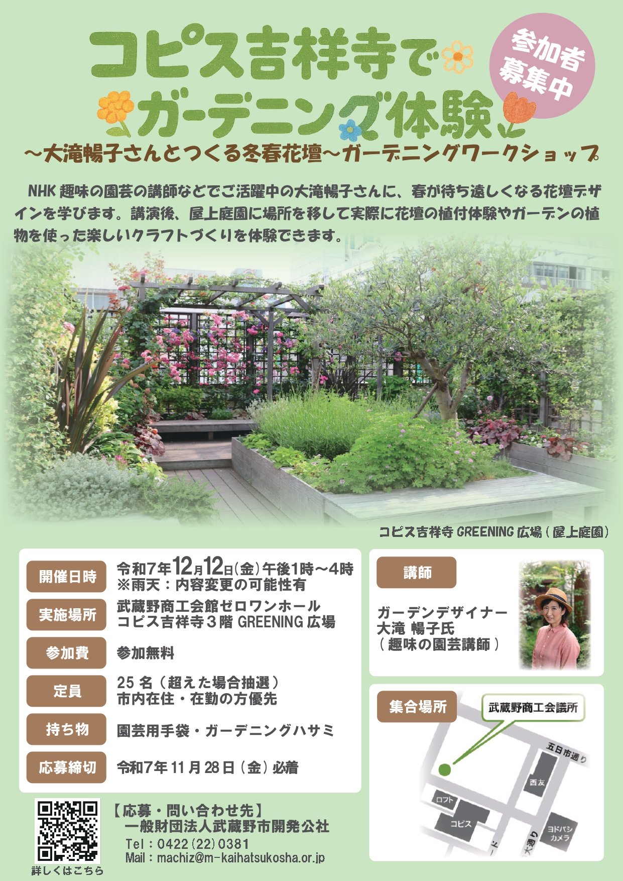 一般財団法人武蔵野市開発公社は、「コピス吉祥寺でガーデニング体験! 〜大滝暢子さんとつくる冬春花壇~」を開催いたします。 今回は、NHK『趣味の園芸』などでご活躍中のガーデンデザイナーの大滝暢子さんをお招きし、春が待ち遠しくなる花壇デザインを学びます。 講演後、コピス吉祥寺の屋上庭園に場所を移して、実際に花壇の植付体験やスワッグ作りもお楽しみいただけます。